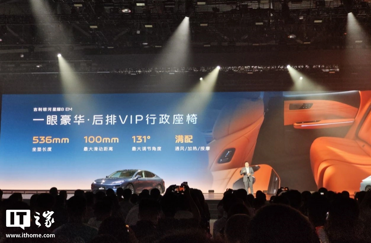 据介绍,该车是全球首款 5m、3L 级豪华电混轿车,全系标配「千里浩瀚」高阶智驾。车内配备后排 VIP 行政座椅,536mm 坐垫长度、100mm 最大滑动距离、131° 最大调节角度、满配通风 / 加热 / 按摩。