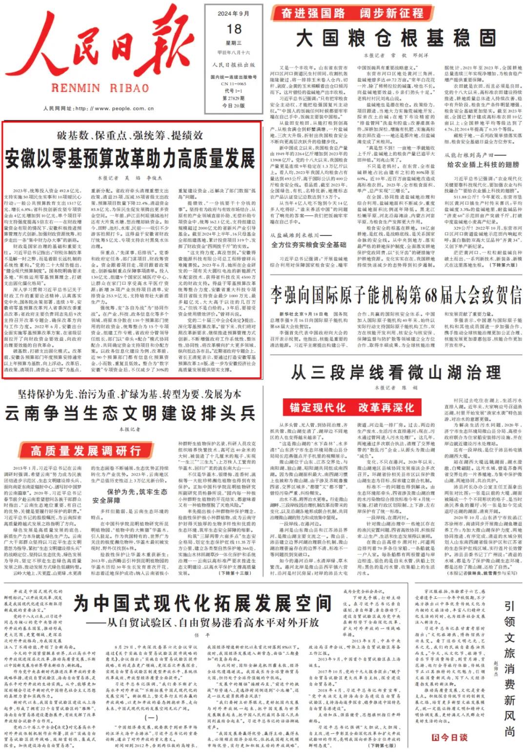 9月18日出版的《人民日报》,头版头条发文关注安徽零基预算改革。