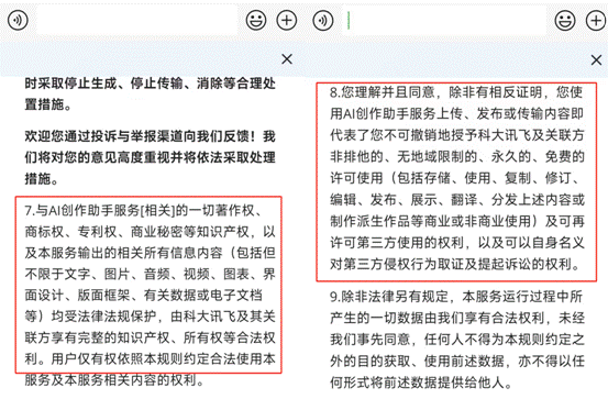不久前,腾讯元宝旧版App用户协议内含“霸王条款”引发热议,腾讯方面随即道歉,并优化了相关协议内容,明确用户在元宝输入和输出的内容,权利归用户或相应权利人所有使用元宝并不会改变归属。但近日,记者发现讯飞输入法的AI创作助手出现了跟旧版元宝相似的“条款”:虽然条款声明用户输入内容的全部权利归用户所有,但其输出内容的知识产权、所有权却归属于科大讯飞及其关联方。