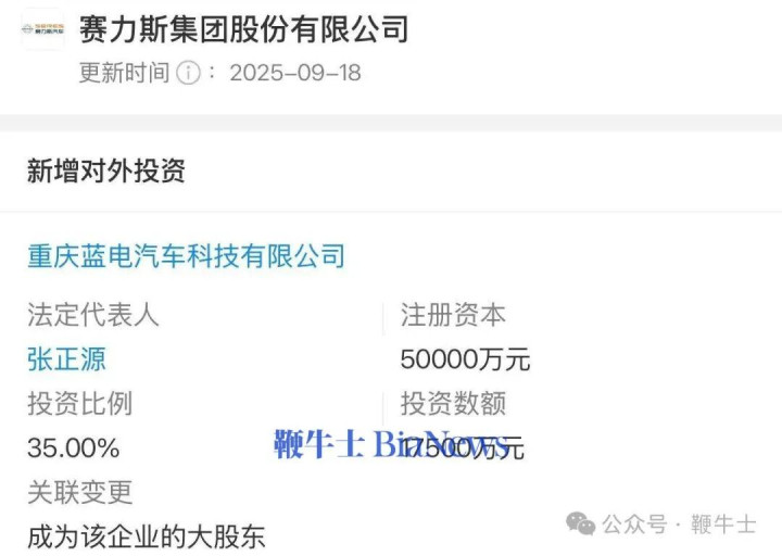这笔投资后,赛力斯集团成为重庆蓝电汽车科技有限公司大股东,拥有35%股份。